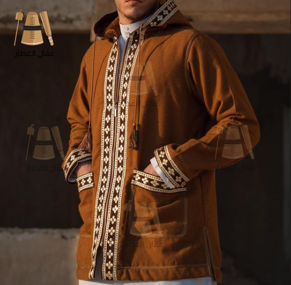An Arabic jacket from Al-Attar, featuring a unique color and an updated classic pattern, made from high-quality natural fabric, tailored to specific measurements, types, and colors.