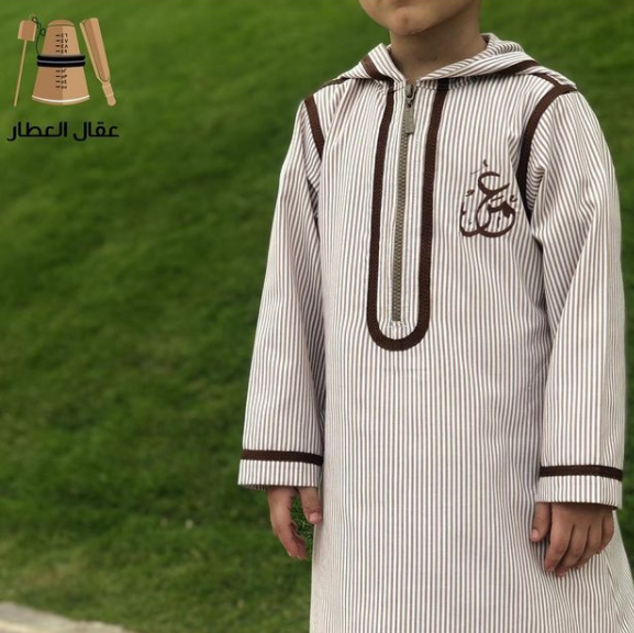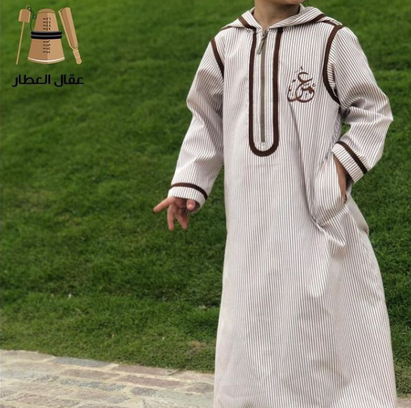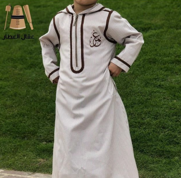 Model 128: A summer galabia made from cotton fabric and embroidered with a name, specially customize to your request at Iqal Al Attar in Qatar.